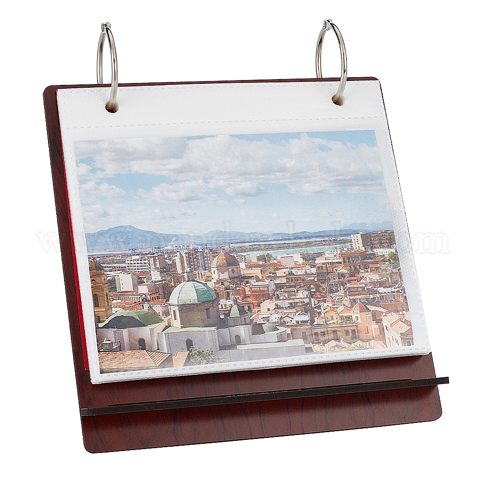 Деревянный настольный календарь с фотоальбомом, перекидной стиль календаря, с железными кольцевыми застежками и пакетами из ПВХ., прямоугольные