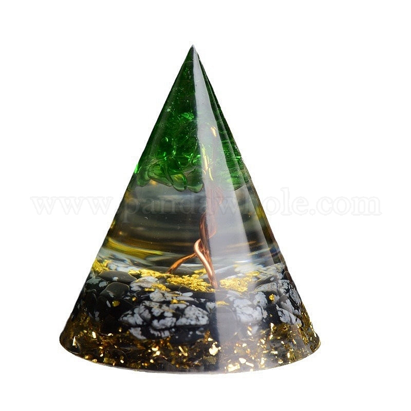 • Снежный Обсидиан Украшения из оргонитовой смолы в виде конуса, с натуральным снежинковым агатом, стеклянная крошка и медные провода внутри, для украшения рабочего стола домашнего офиса, 65 мм