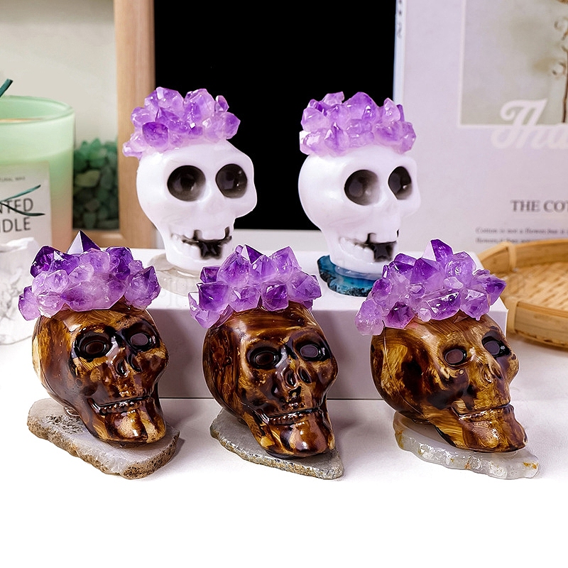 Тема Хэллоуина натуральный аметист чипсы увенчанный фигуркой черепа, с агатовым основанием, украшение домашнего офиса