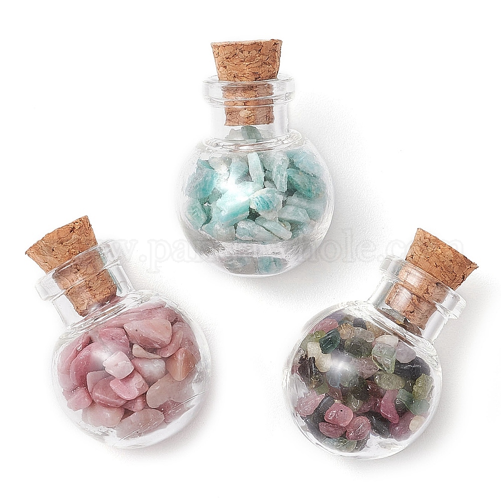 3шт. стеклянные бутылки с желаниями, с бусинами из натурального камня и деревянной пробкой, круглые (02Z8DK)