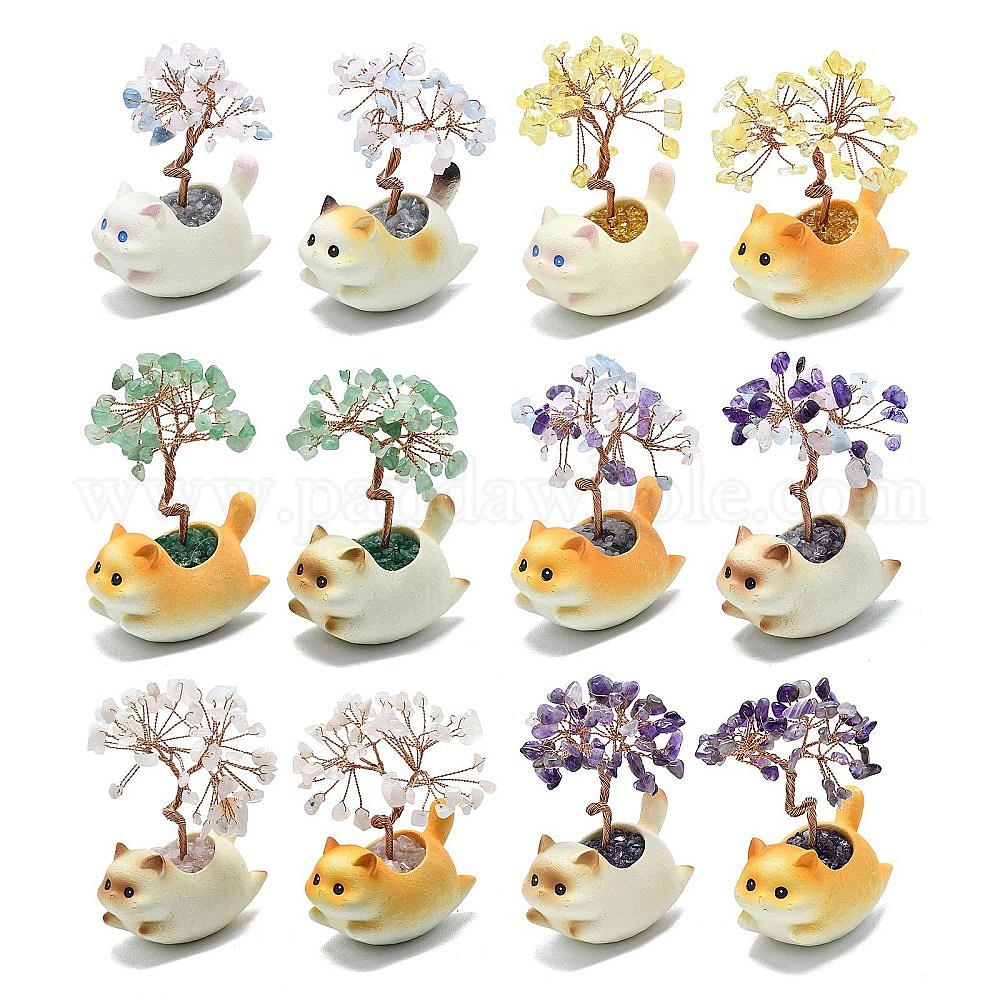 Украшения из натуральных драгоценных камней в виде дерева жизни с кошачьими украшениями, с керамической основой разных цветов и медной проволокой, фен-шуй энергетический камень подарок для домашнего офиса украшение рабочего стола