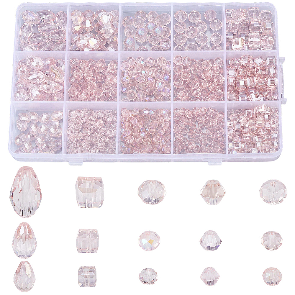 • Pink 630 шт. 15 стили гальванических стеклянных бусин, с покрытием AB цвета, граненые, рондель, куб, биконус, каплевидная форма, розовые, 4~8 мм