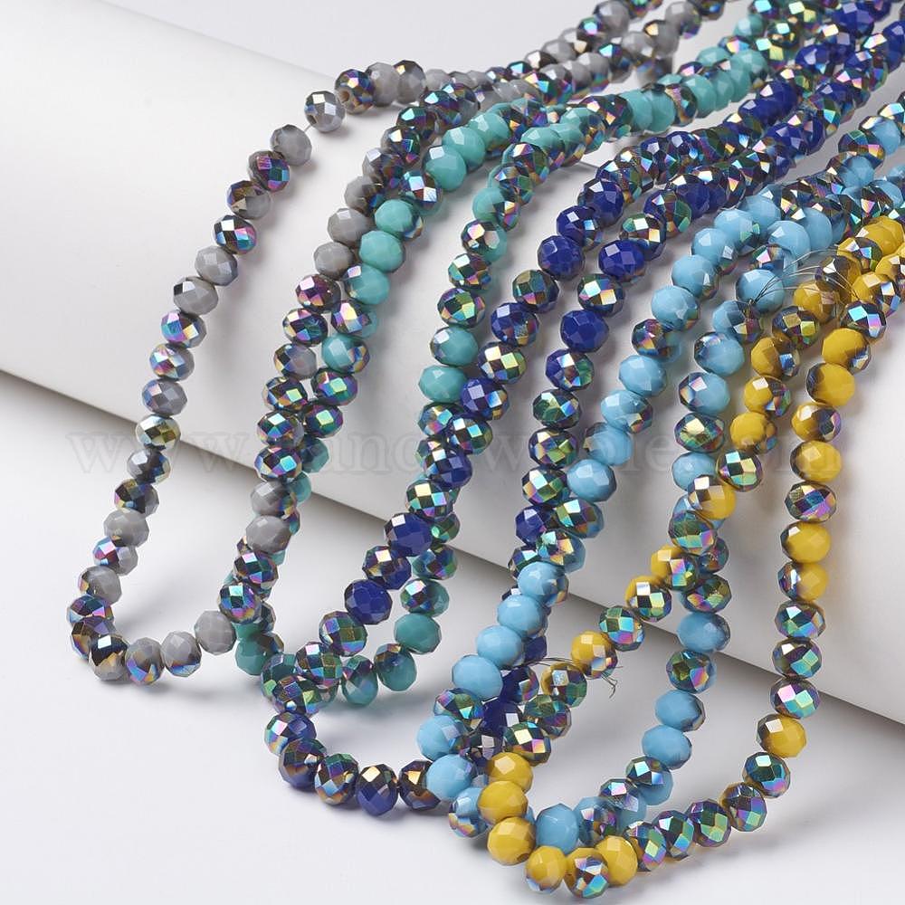 • Льняное Полотно Гальванические непрозрачные стеклянные бусины, половина многоцветные покрытием, граненые, рондель, белье, 4x3 мм, отверстие : 0.4 мм, около 105~110 шт / нитка, 38~39 см