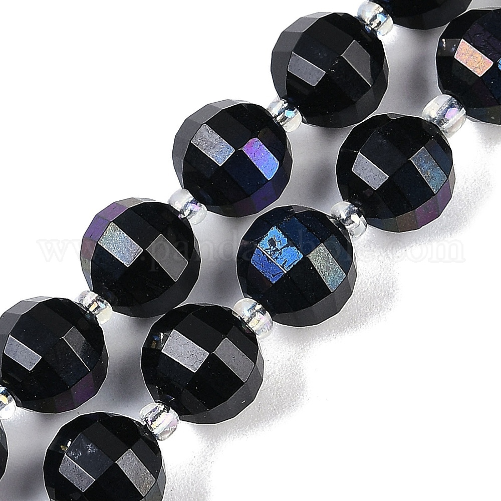 Нити бусин из натурального черного оникса с гальваническим покрытием (окрашенные и нагретые), граненые, фонарь, с бисером