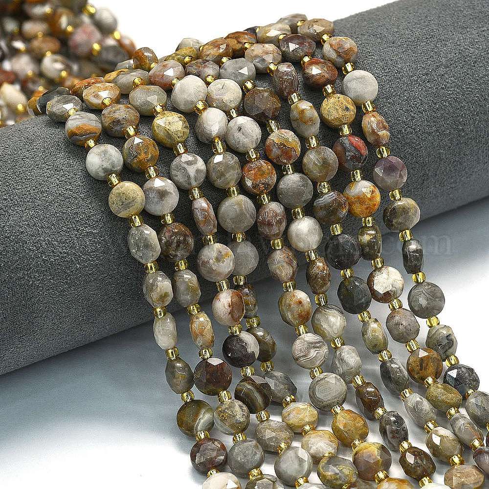 Натуральные нити бусин агата, граненый пятиугольный разрез, плоско-круглые, с бисером