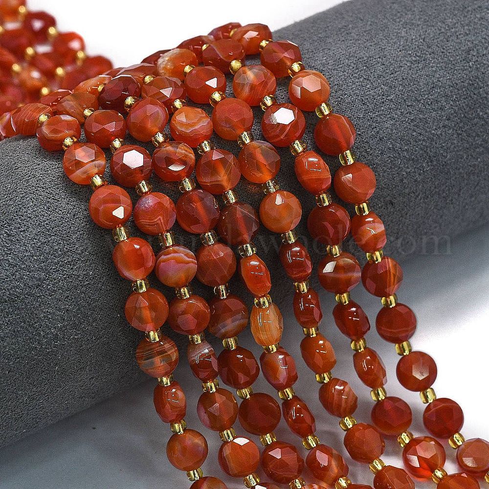 Нити бусин из натурального красного полосатого агата/полосчатого агата (окрашенного и нагретого), граненый пятиугольный разрез, плоско-круглые, с бисером