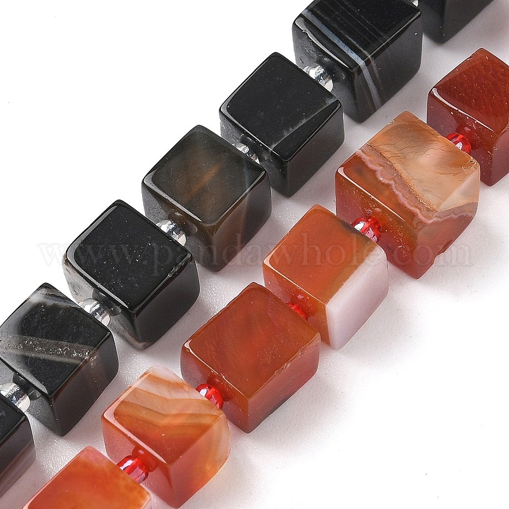 Нити бусин из натурального полосчатого агата (окрашенного и нагретого), кубические, с бисером