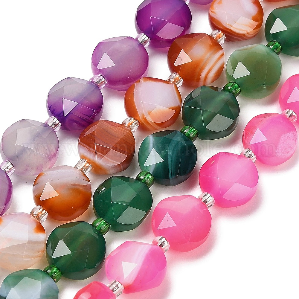 Натуральные полосатые агатовые бусы, граненый пятиугольный разрез, окрашенная и подогревом, плоско-круглые, с бисером