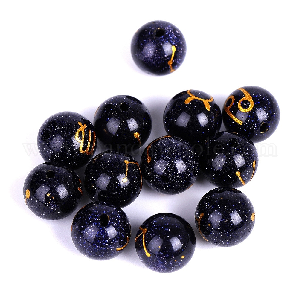 • Телец Синтетические синие золотые бусины с резными созвездиями, круглые бусины, Телец, 10 мм