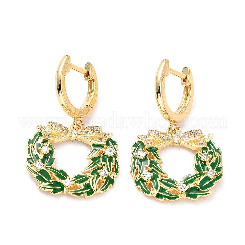 Серьги-кольца Huggie Huggie из латуни с микропаве и кубическим цирконием на рождество, с эмалью, без свинца, без кадмия и с низким содержанием никеля, Рождественский венок, зелёные