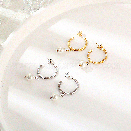 • Нержавеющая Сталь Цвет 304 кольцо из нержавеющей стали, серьги-полукольца, натуральная жемчужина болтается серьги, цвет нержавеющей стали, 35x20 мм