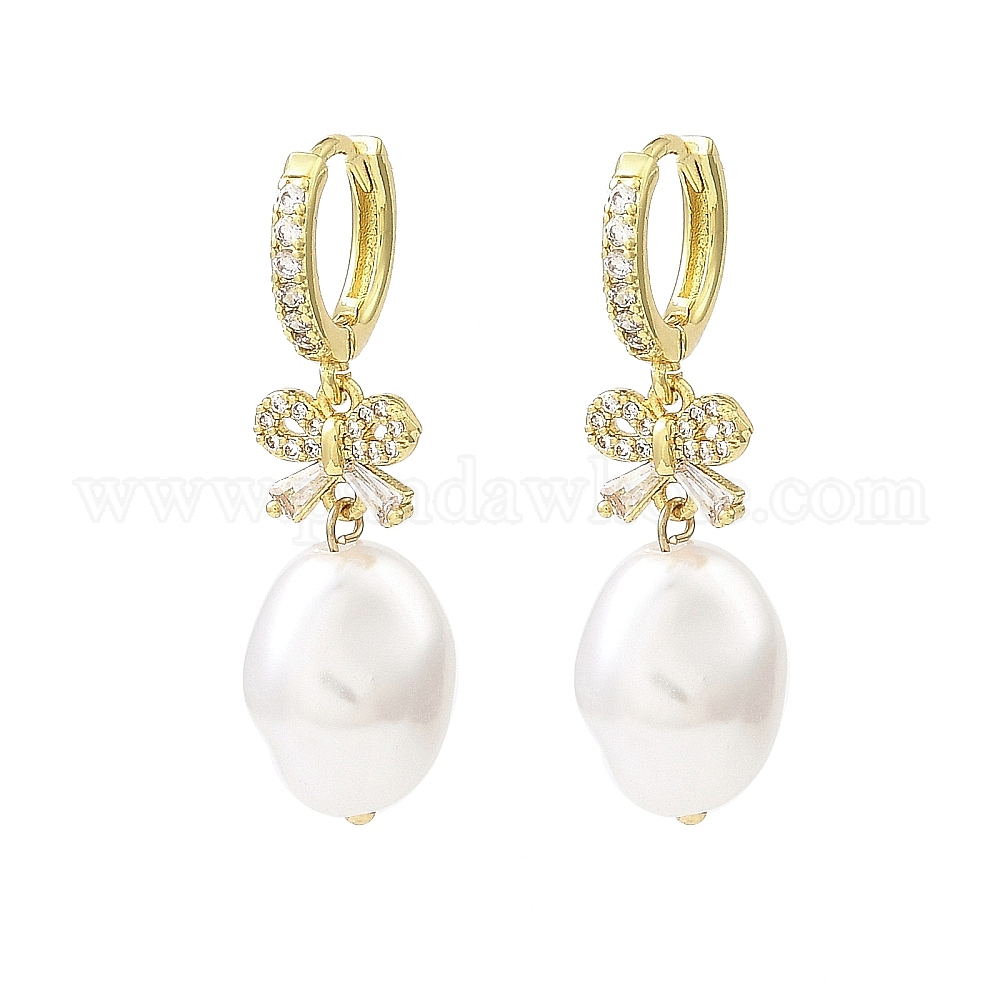 Серьги-кольца из латуни с микро-паве и бантиком из циркония, с пластиковыми жемчужные бусины, долговечный, без свинца и без кадмия