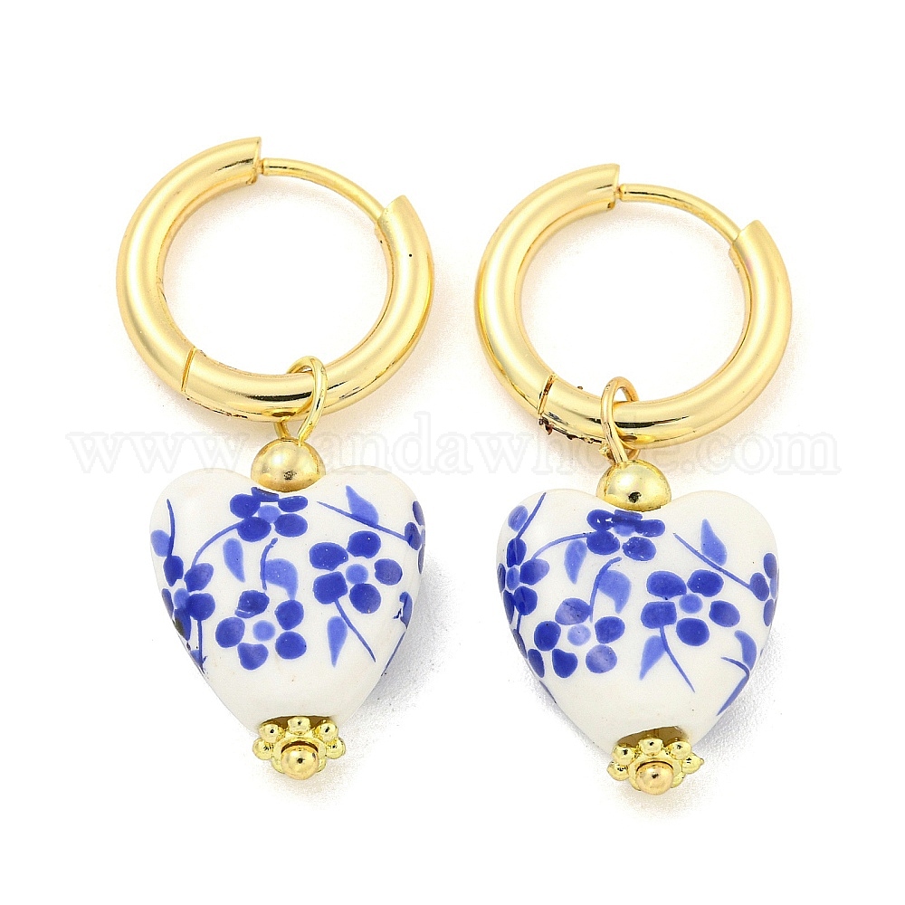 • Золотой Фарфоровые сережки-кольца ручной работы из синего и белого фарфора в виде сердечек, 304 женские серьги с подвесками из нержавеющей стали, золотые, 36.5x15 мм