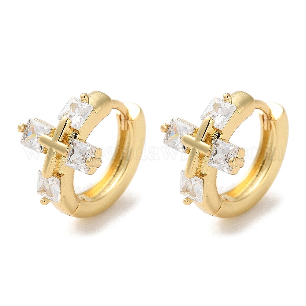 • Настоящее золото 16K Серьги-кольца из латуни с прозрачным кубическим цирконием, крестик, реальный 16 k позолоченный, 14x10.5 мм