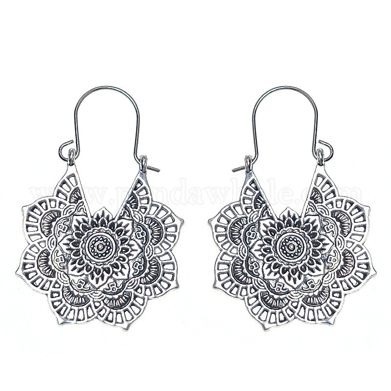 • Античное Серебро Серьги-кольца из сплава в стиле бохо-тибета для женщин, цветок, античное серебро, 45x27 мм