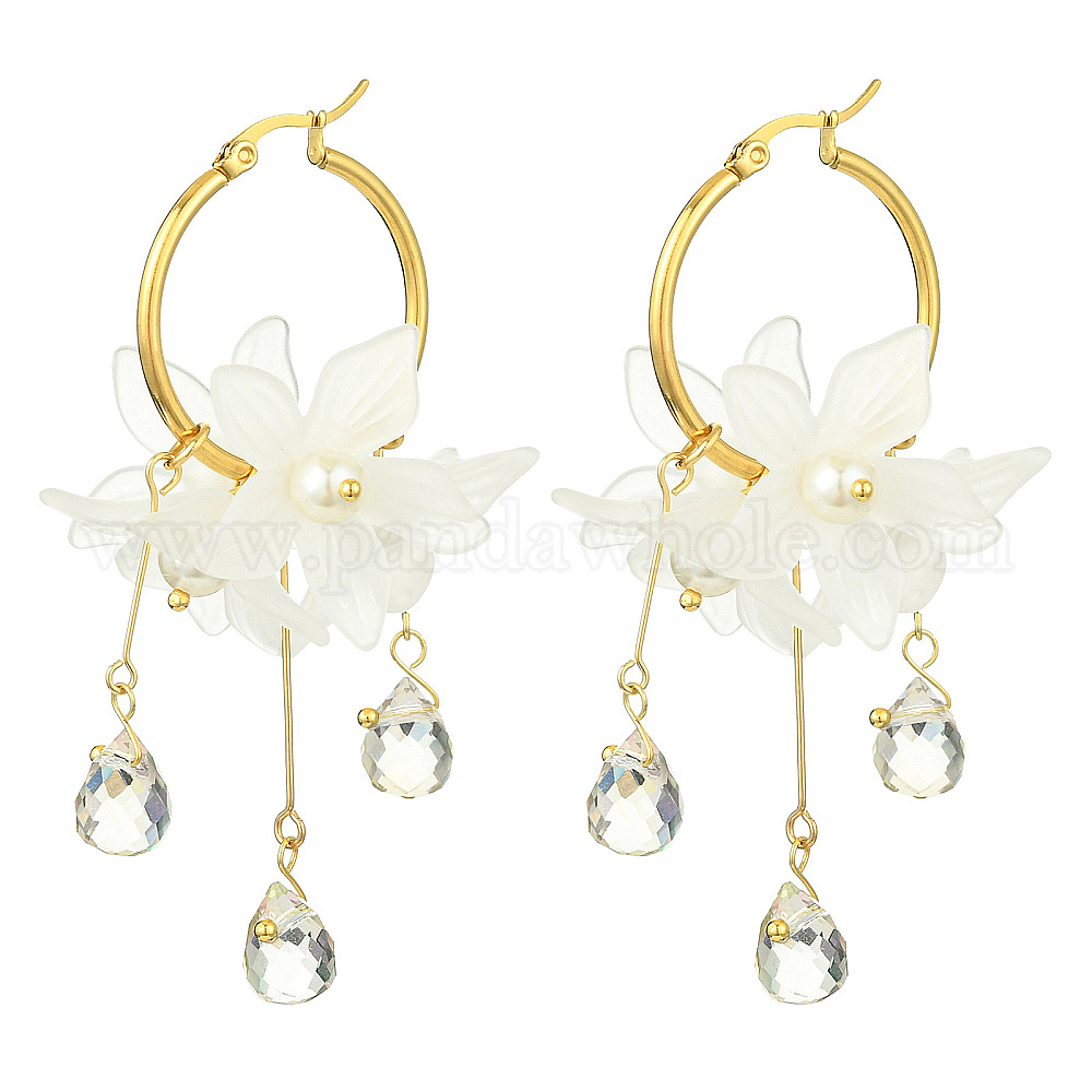 Женские серьги-кольца из акрила, стекла и ракушек с жемчугом, цветок, белые