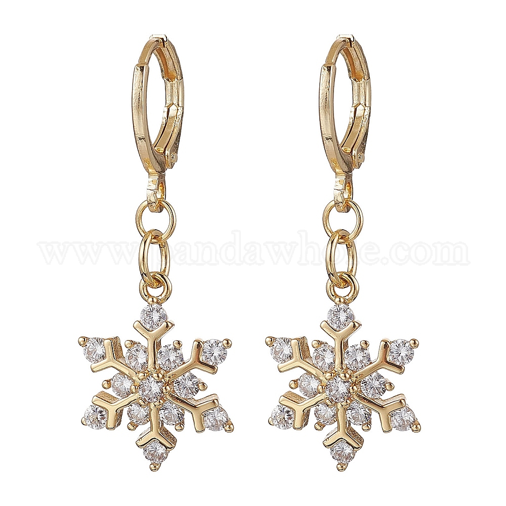 Серьги-кольца с рождественскими снежинками из латуни с микропаве из прозрачных кубических цирконий, с фурнитурой в виде серьги-кольца Huggie