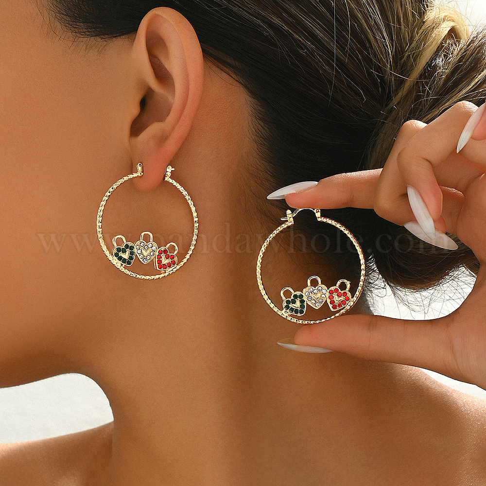 • Сердце 201 геометрические ретро-серьги-кольца из нержавеющей стали, реальный 18 k позолоченный, со стразами, сердце, 43x40 мм