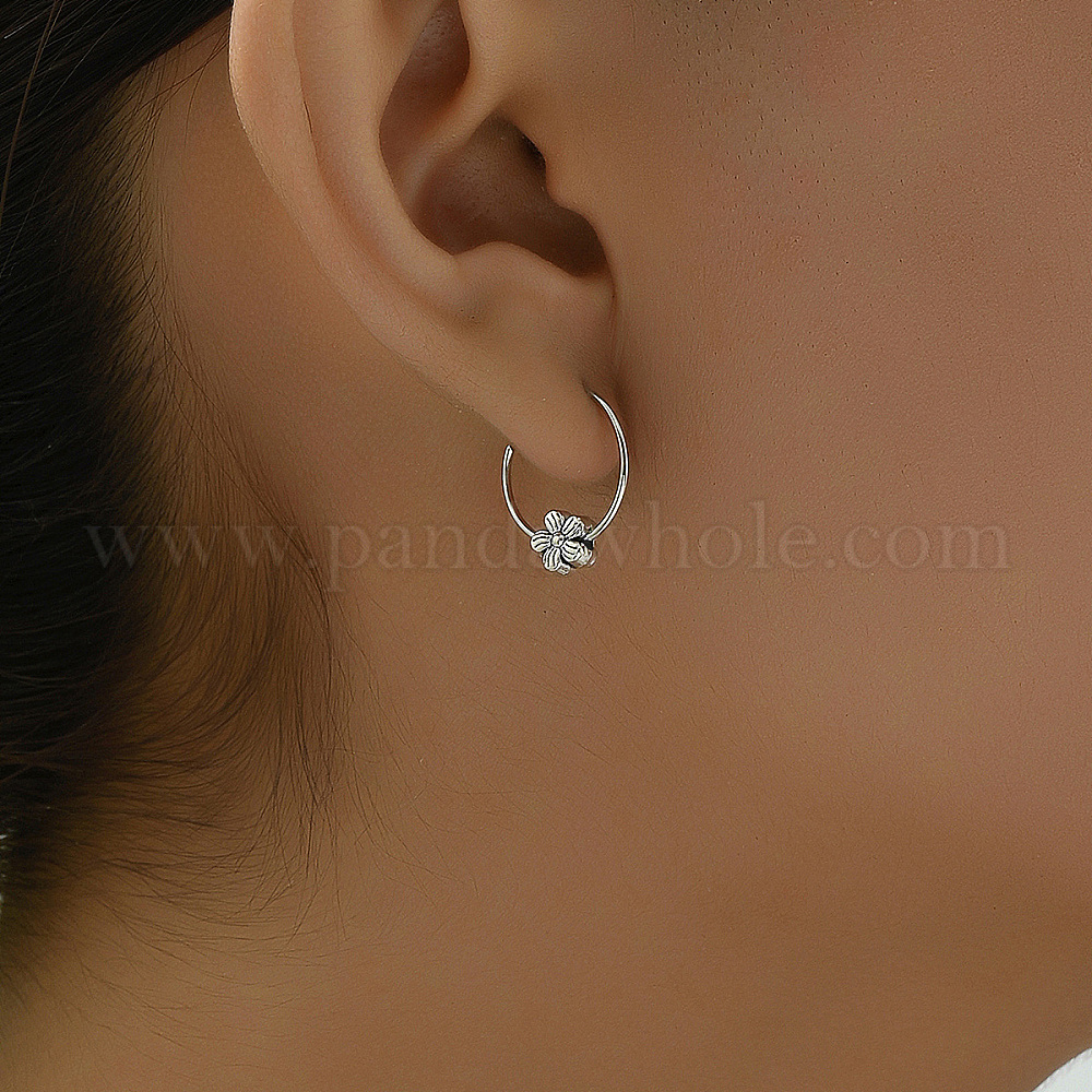 • Серебро Классические латунные серьги-кольца с цветком, серебряные, 15x15 мм