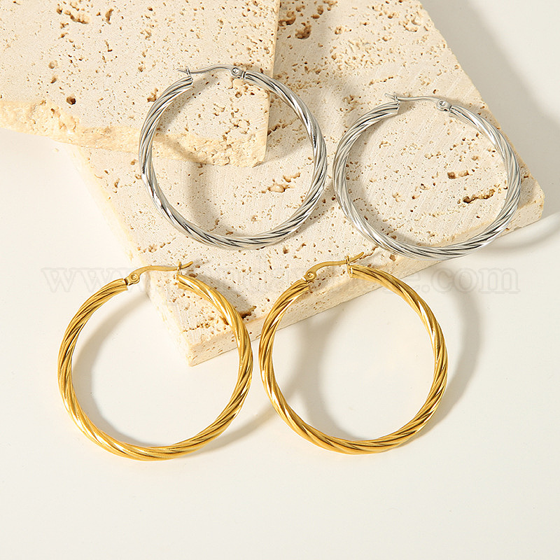 • Настоящее золото 18K Преувеличенные 304 витые серьги-кольца из нержавеющей стали, реальный 18 k позолоченный, 48x49x3.5 мм
