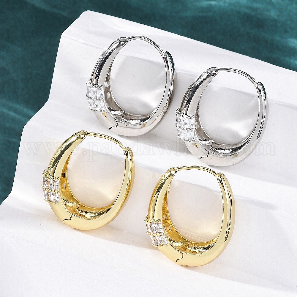 Овальные серьги-кольца из латуни с микропаве из прозрачных кубических цирконий, без кадмия и без свинца, долговечный, стойки покрытие