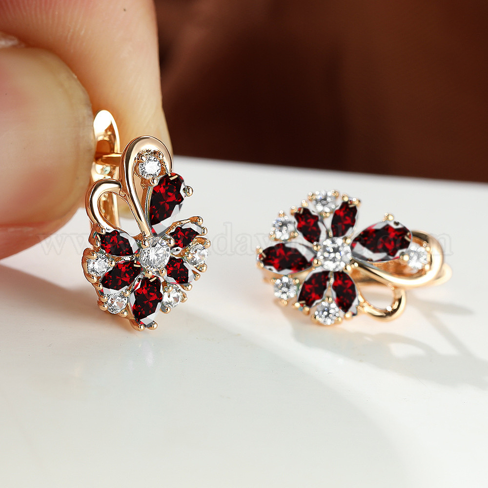 • Темно-Красный Латунные микро проложить серьги обруча кубического циркония, цветок, золотые, темно-красный, 16x11 мм