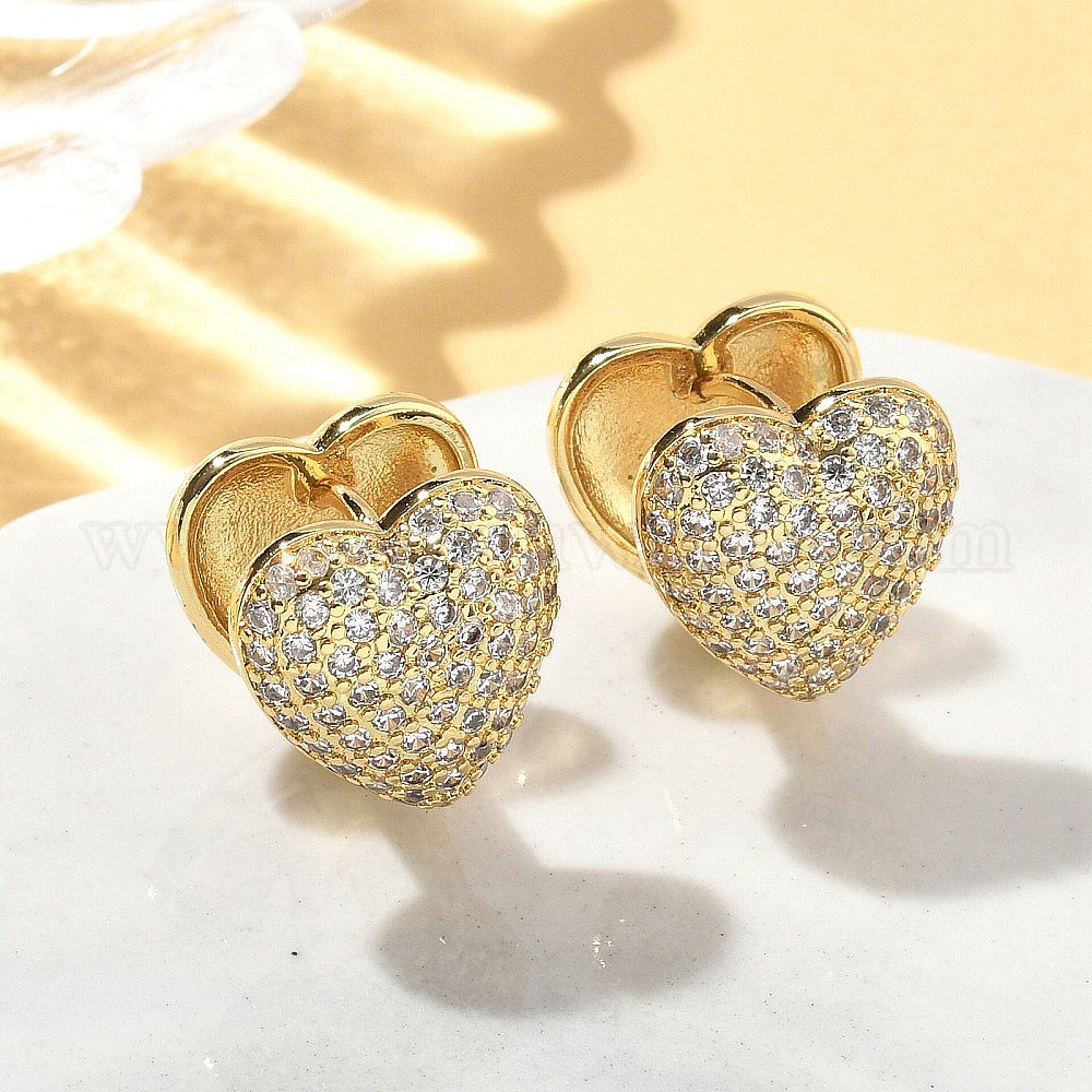 Серьги-кольца из латуни с микропаве и прозрачным кубическим цирконием в форме сердца, без свинца и без кадмия, долговечный (034477)