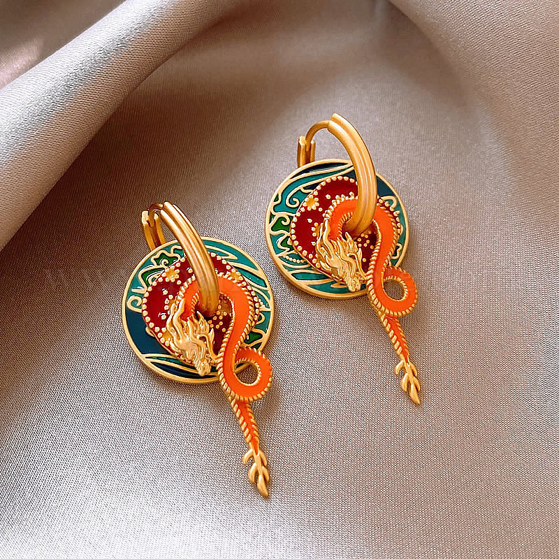 Серьги-кольца с драконом, плоскими, круглыми и цветочными мотивами из латуни и эмали