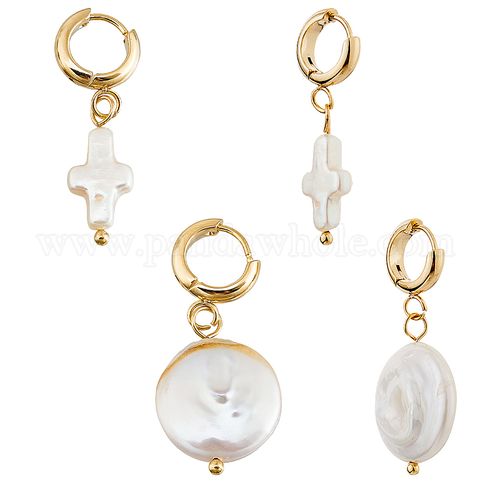 Серьги из 201 нержавеющей стали, с натуральной жемчужиной, плоский круглый крест