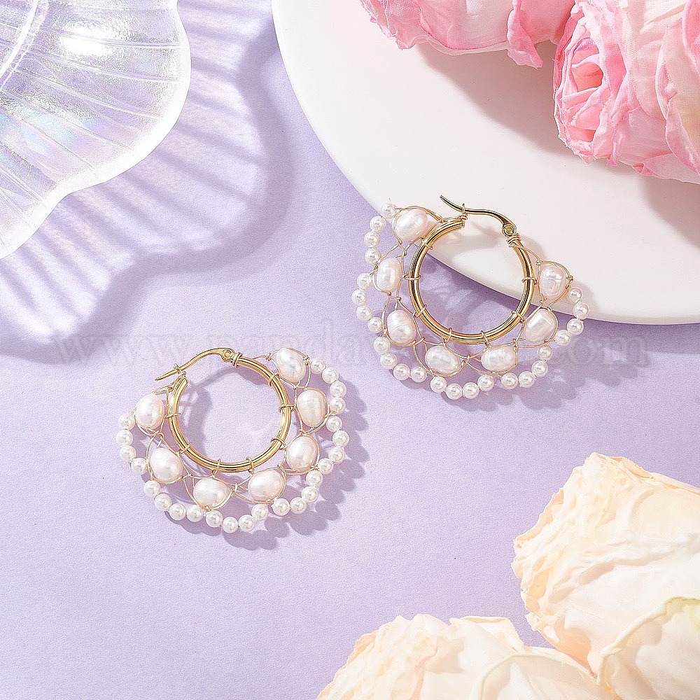 Серьги-кольца с цветком из натурального культивированного пресноводного жемчуга, с жемчугом из раковины , ионное покрытие (IP) 304 серьги-кольца из нержавеющей стали и экологически чистая медная проволока