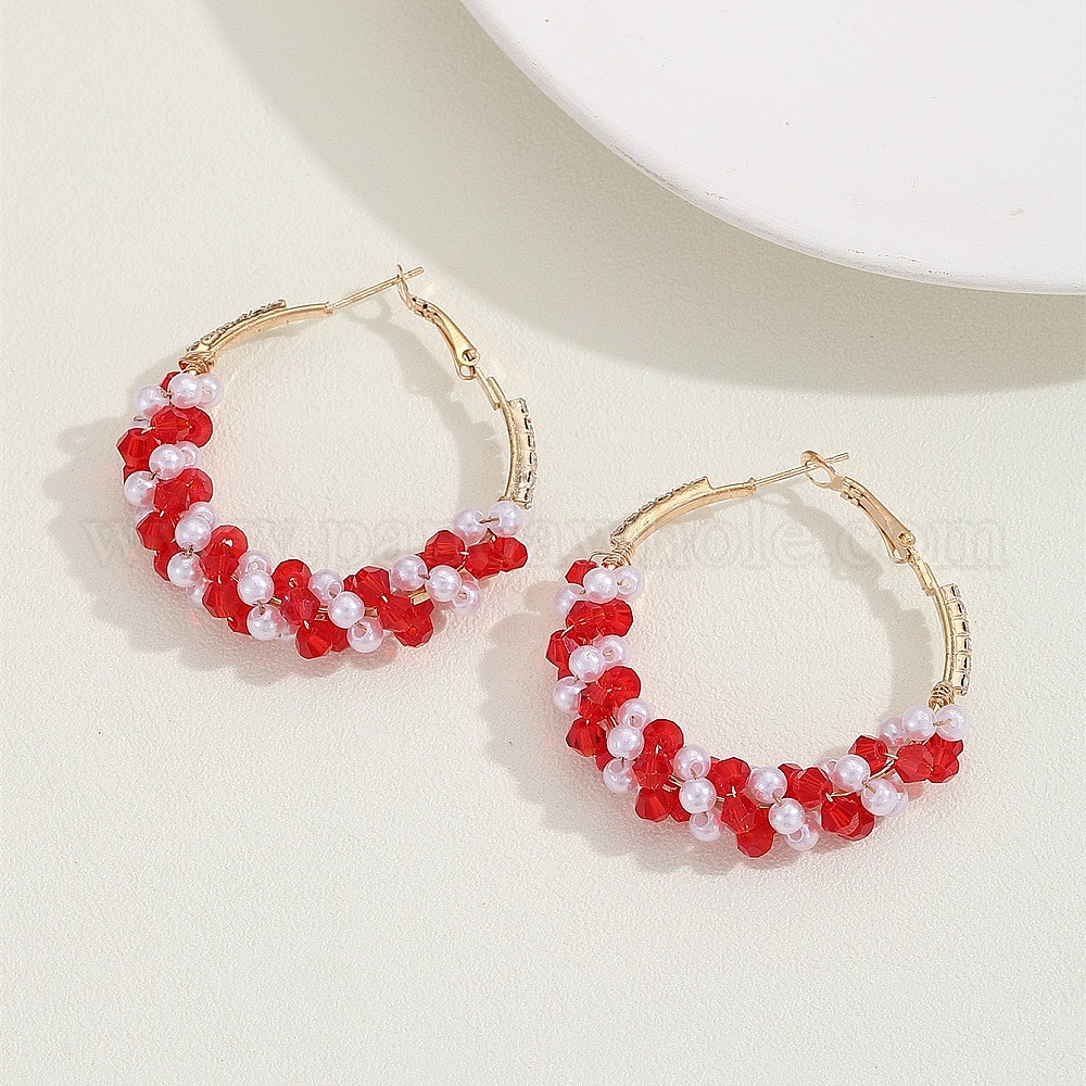 • Красный Серьги-кольца из сплава и стеклянных бусин, красные, 50 мм