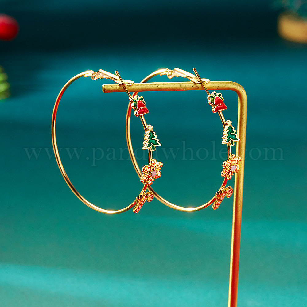 Серьги-кольца из сплава с эмалью в форме елки, со стразами и пластиковым жемчугом, золотые (038DGF)