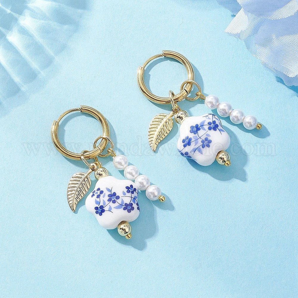 Серьги-кольца из латуни с цветком и листом, с фарфоровыми бусинами и бусинами из культивированного пресноводного жемчуга