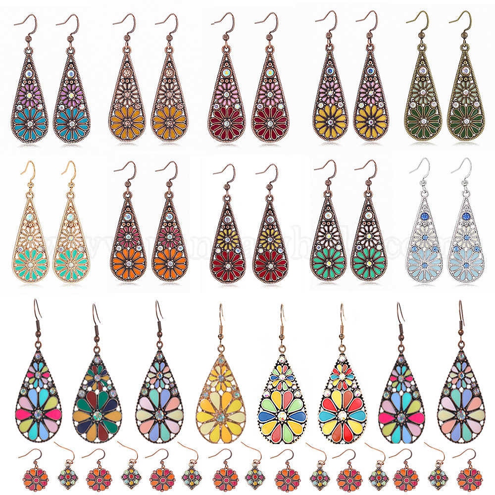 Серьги-подвески из богемского сплава с эмалью, со стразами, слезинка с цветочным узором