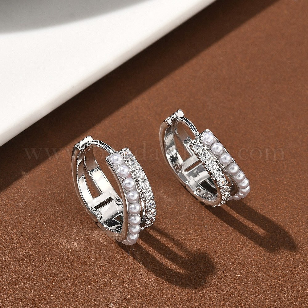 Двухслойные латунные серьги-кольца с микропаве из прозрачных кубических цирконий., с пластмассовой жемчужиной abs, без кадмия и без свинца, долговечный, стойки покрытие