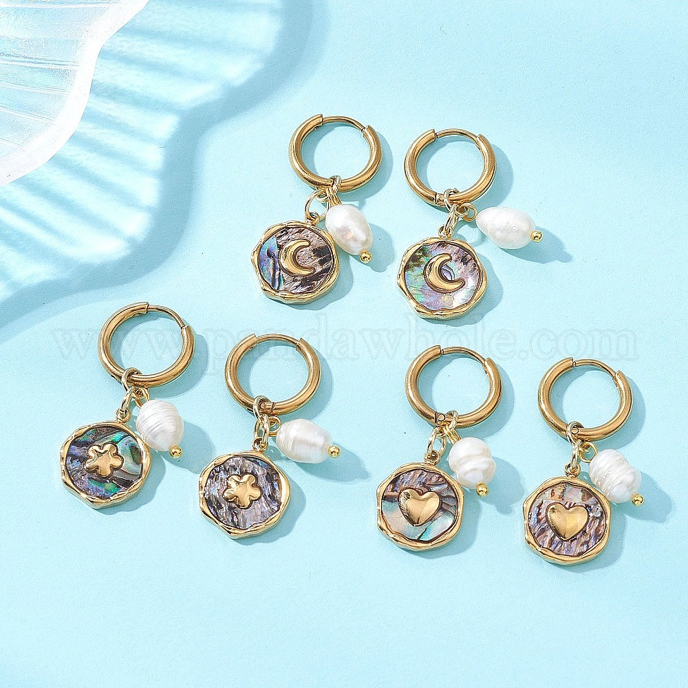 3 пары 3 стили 304 серьги-кольца из нержавеющей стали и натуральной раковины пауа, с 304 серьгами-кольцами из нержавеющей стали, плоско-круглые, золотые, с имитацией жемчуга