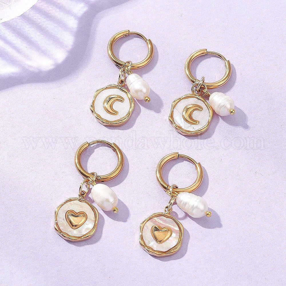 2 пары 2 стили 304 серьги-кольца из нержавеющей стали и натуральных ракушек, с 304 серьгами-кольцами из нержавеющей стали, Плоское круглое изображение с сердцем и луной, с имитацией жемчуга, золотые
