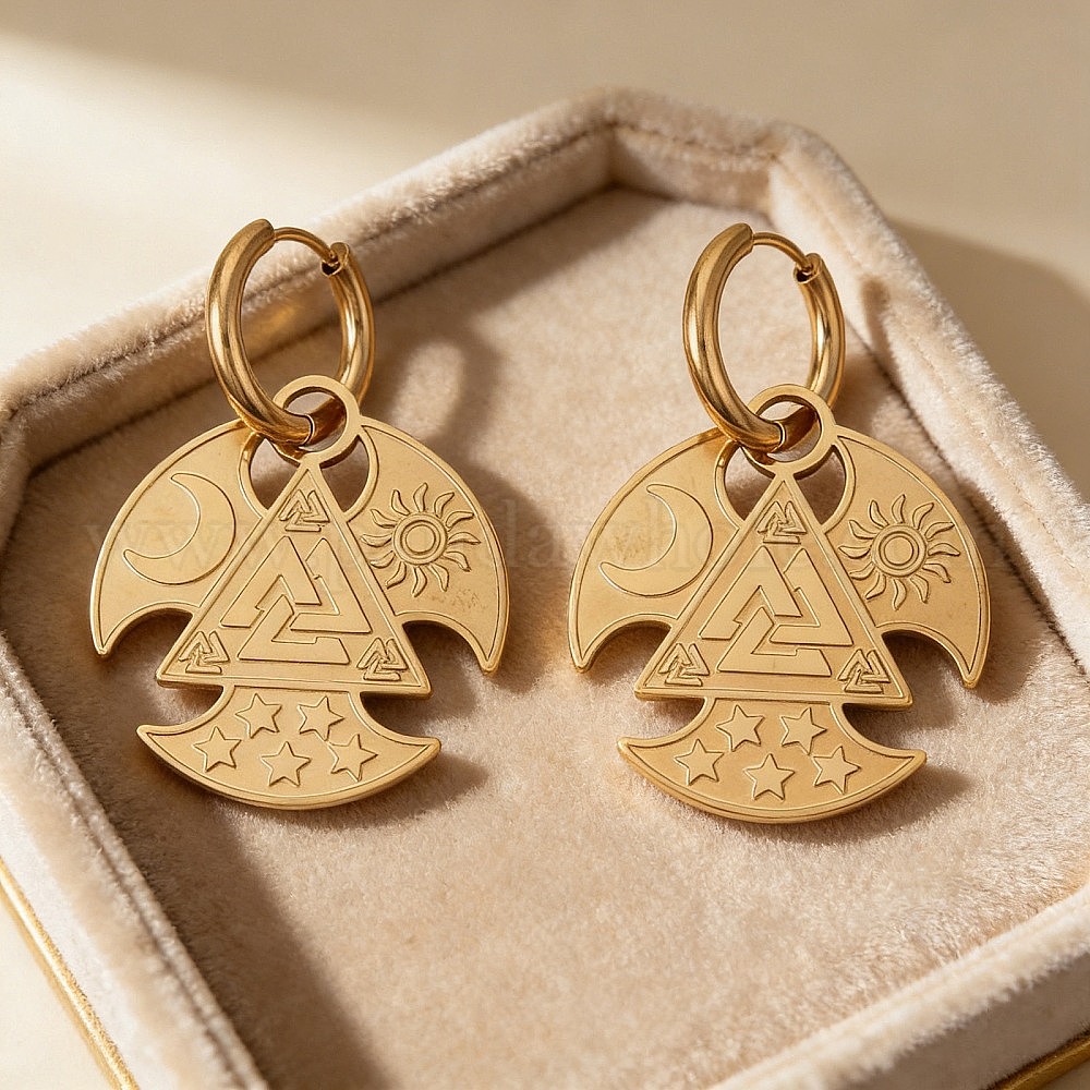 • Золотой Серьги из 304 нержавеющей стали, валькнут с солнцем, луна и звезда, золотые, 45x30 мм