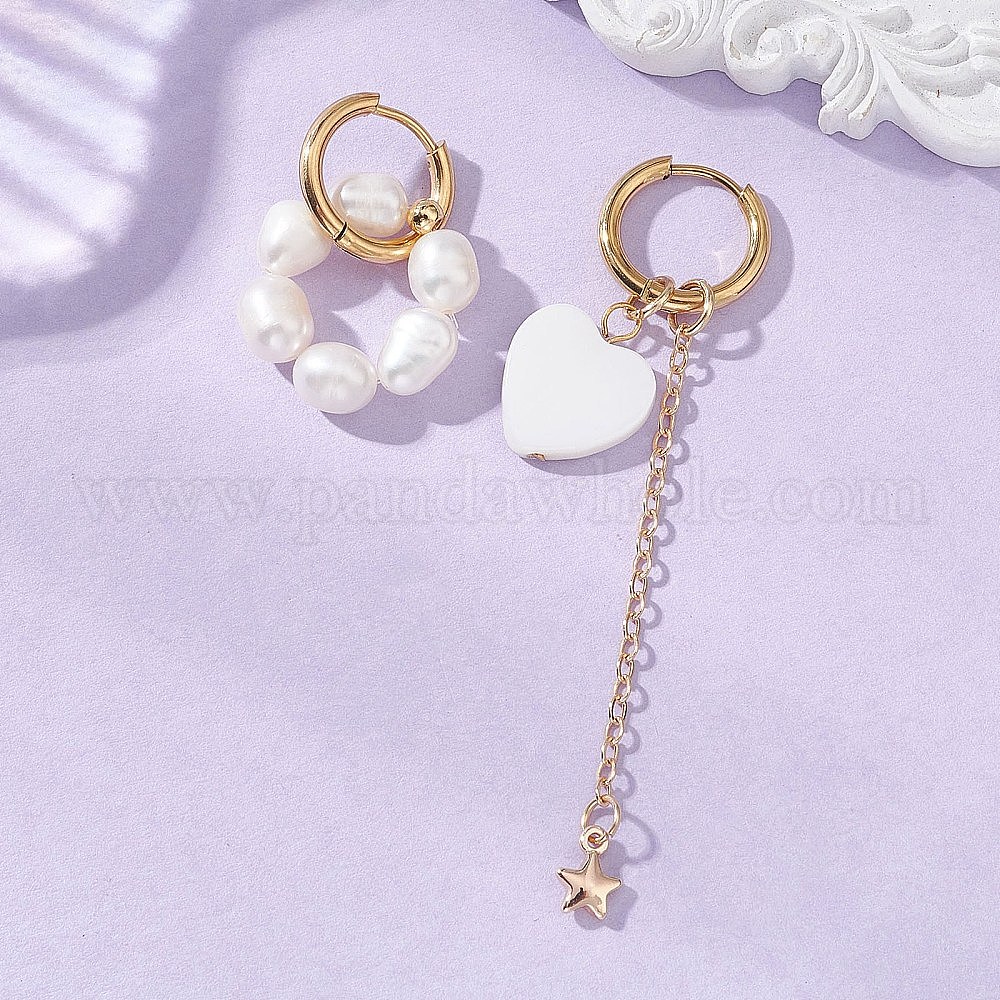 Сердечко ко Дню святого Валентина 304 Серьги-кольца из нержавеющей стали, с натуральным культивированным пресноводным жемчугом, слева и справа