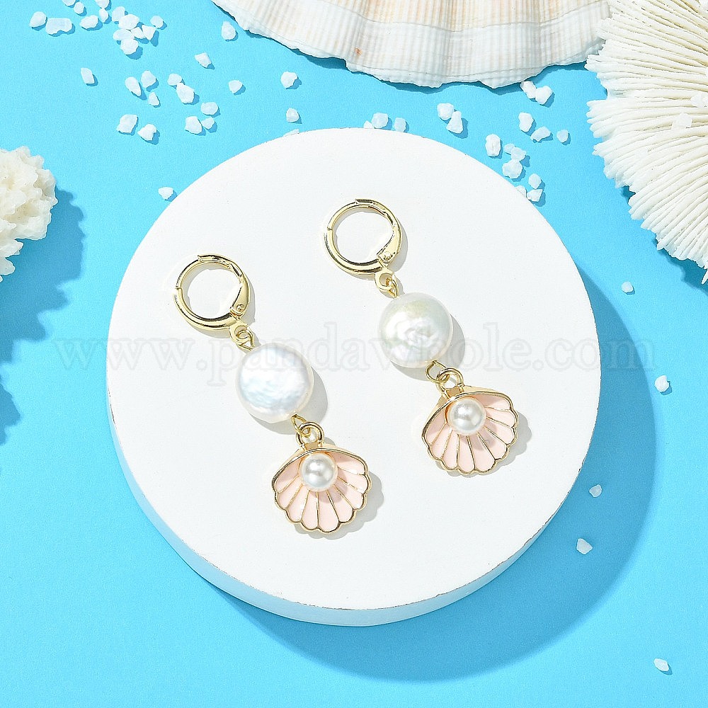 Серьги-кольца из натурального жемчуга и сплава, с эмалью и жемчужинами из АБС-пластика, плоский круглый в форме ракушки