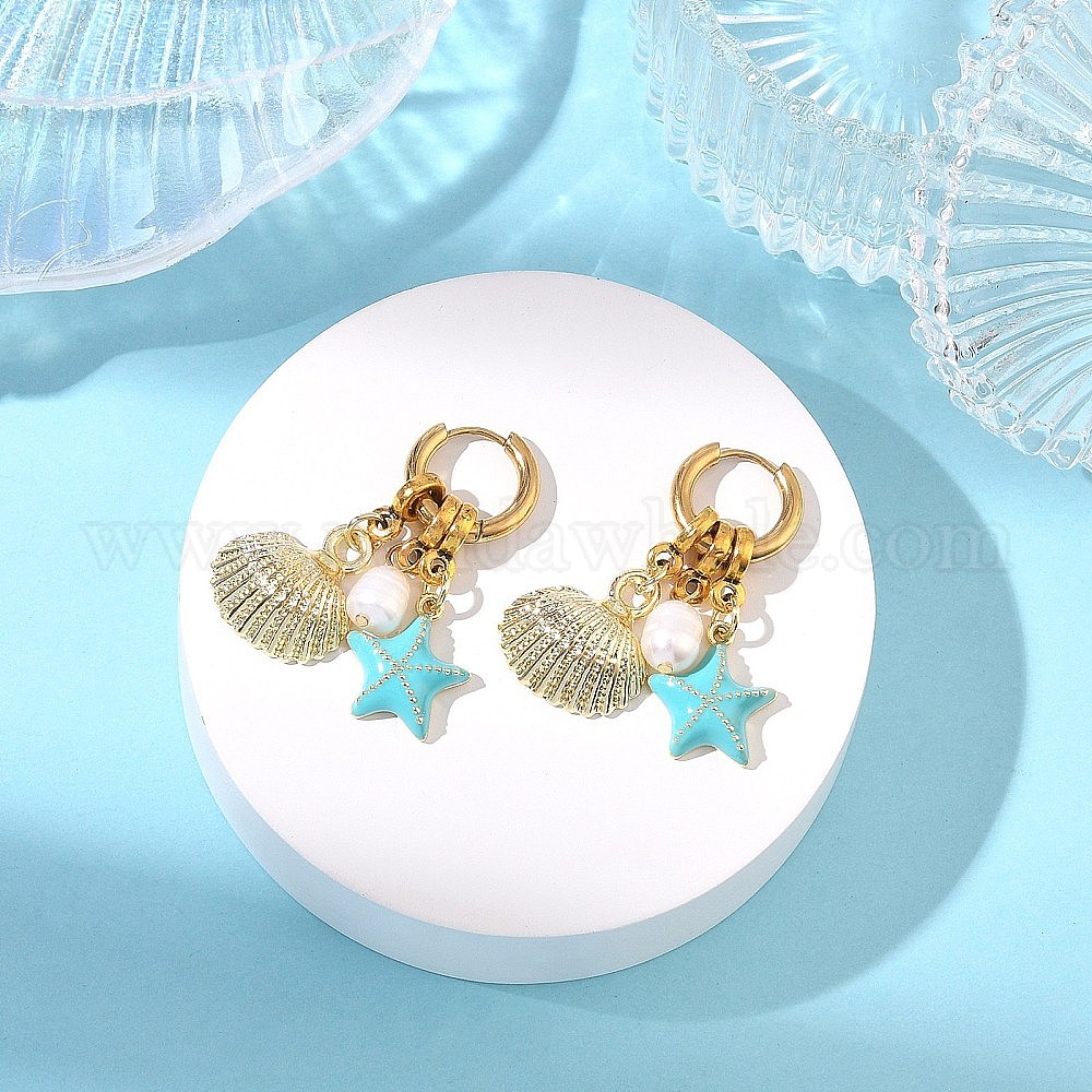 Подвеска в виде морской звезды с ракушкой 202 Серьги-кольца из нержавеющей стали, с подвесками из натурального культивированного пресноводного жемчуга, латунной эмали и сплавов.