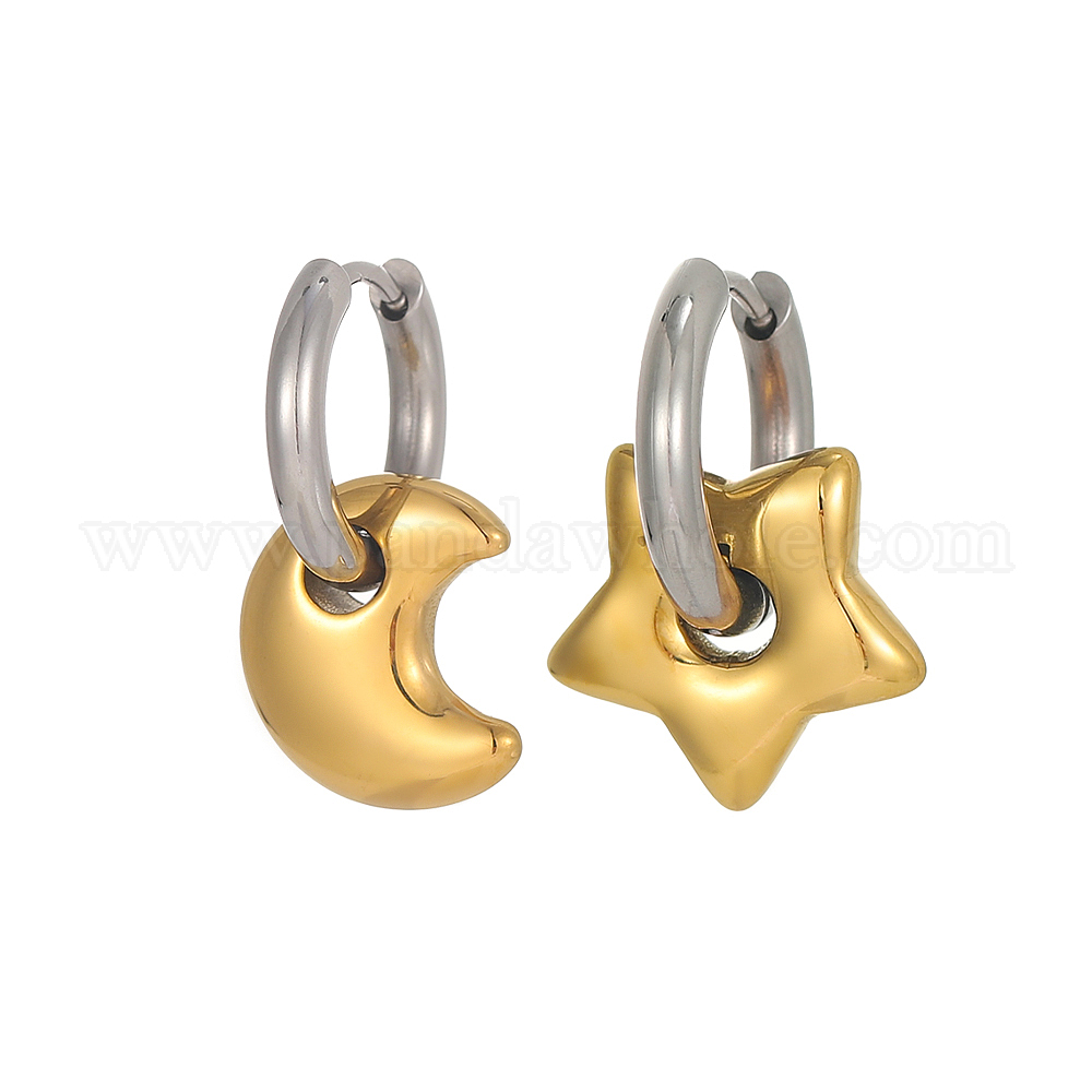 Два тона 304 из нержавеющей стали серьги обруча, Луна и звезды, ионное покрытие (ip), слева и справа
