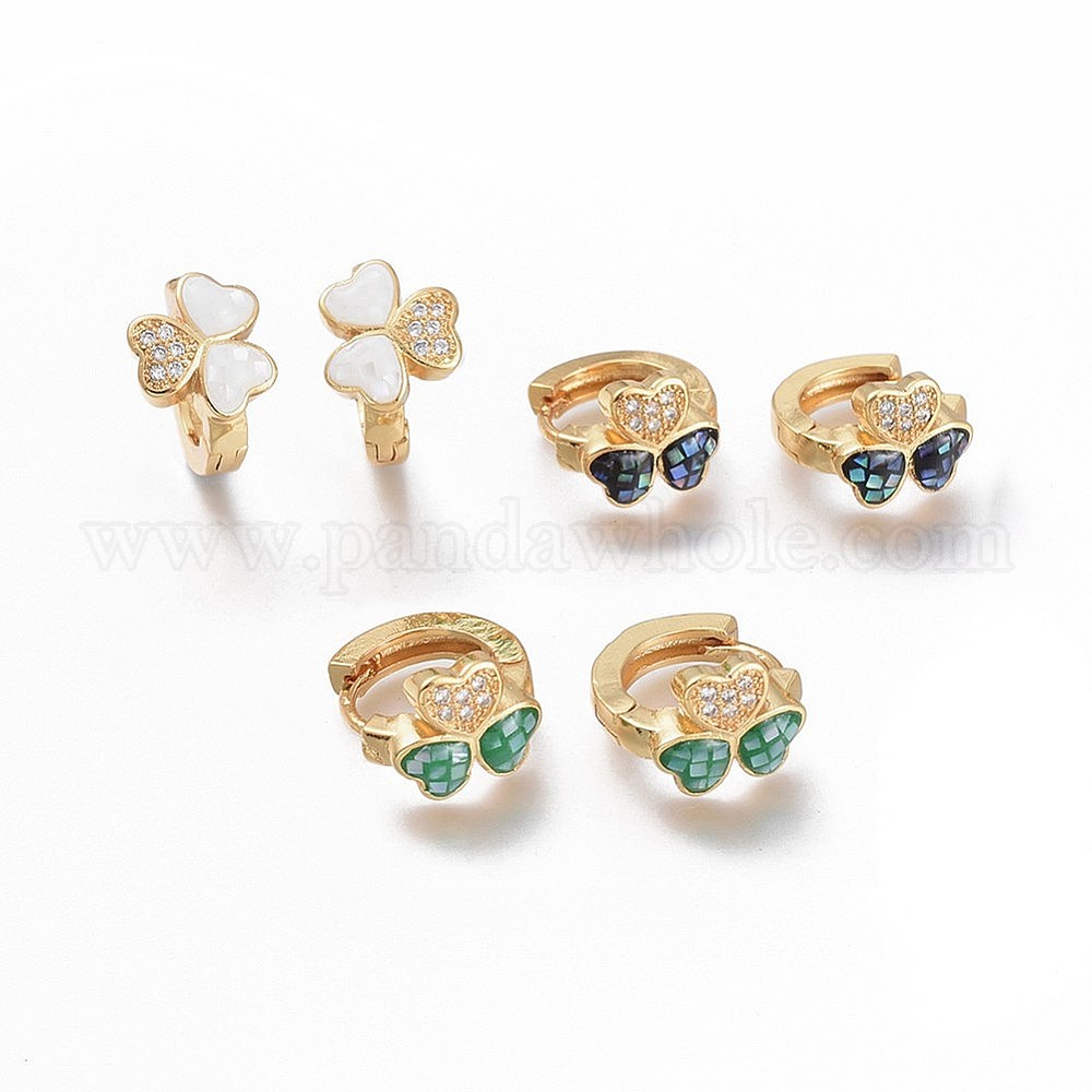 • Золотой Серьги-кольца из латуни с микропаве из прозрачного кубического циркония, с естественной оболочке, долговечный, трилистник, золотые, 10.5x9x2.2 мм, штифты : 1 мм