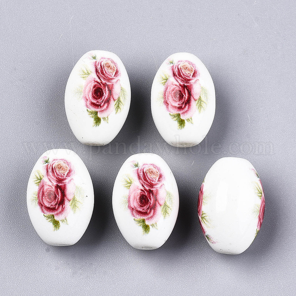 Непрозрачные стеклянные бусины с набивным рисунком и нанесением распылением, овальные с цветочным узором