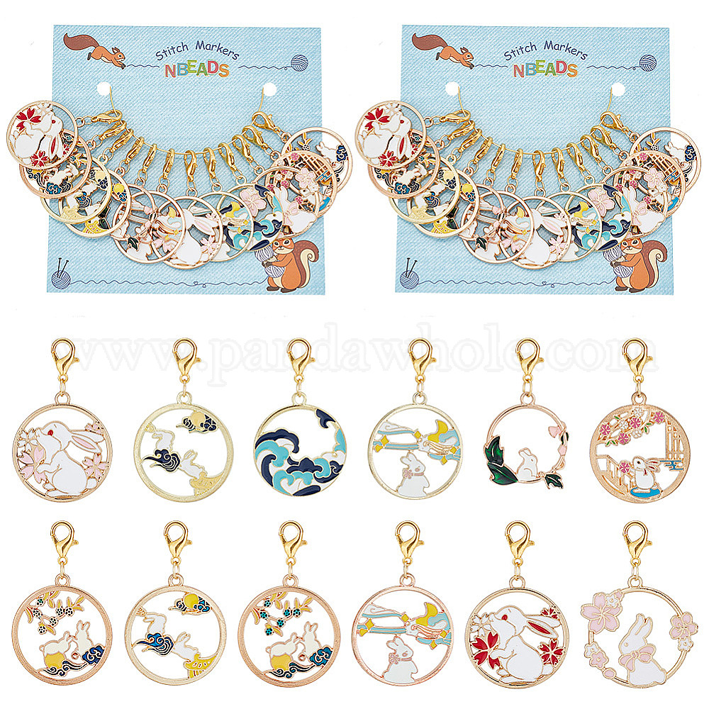 • (52) Непрозрачная лаванда Плоская круглая пряжка в китайском стиле с маркерами петель в виде кролика/волны, подвески из сплава эмали крючком с застежкой-лобстером, маркер с замком и кольцом с подвеской в виде винного бокала, разноцветные, 3.5~4.2 см, 12 шт / комплект