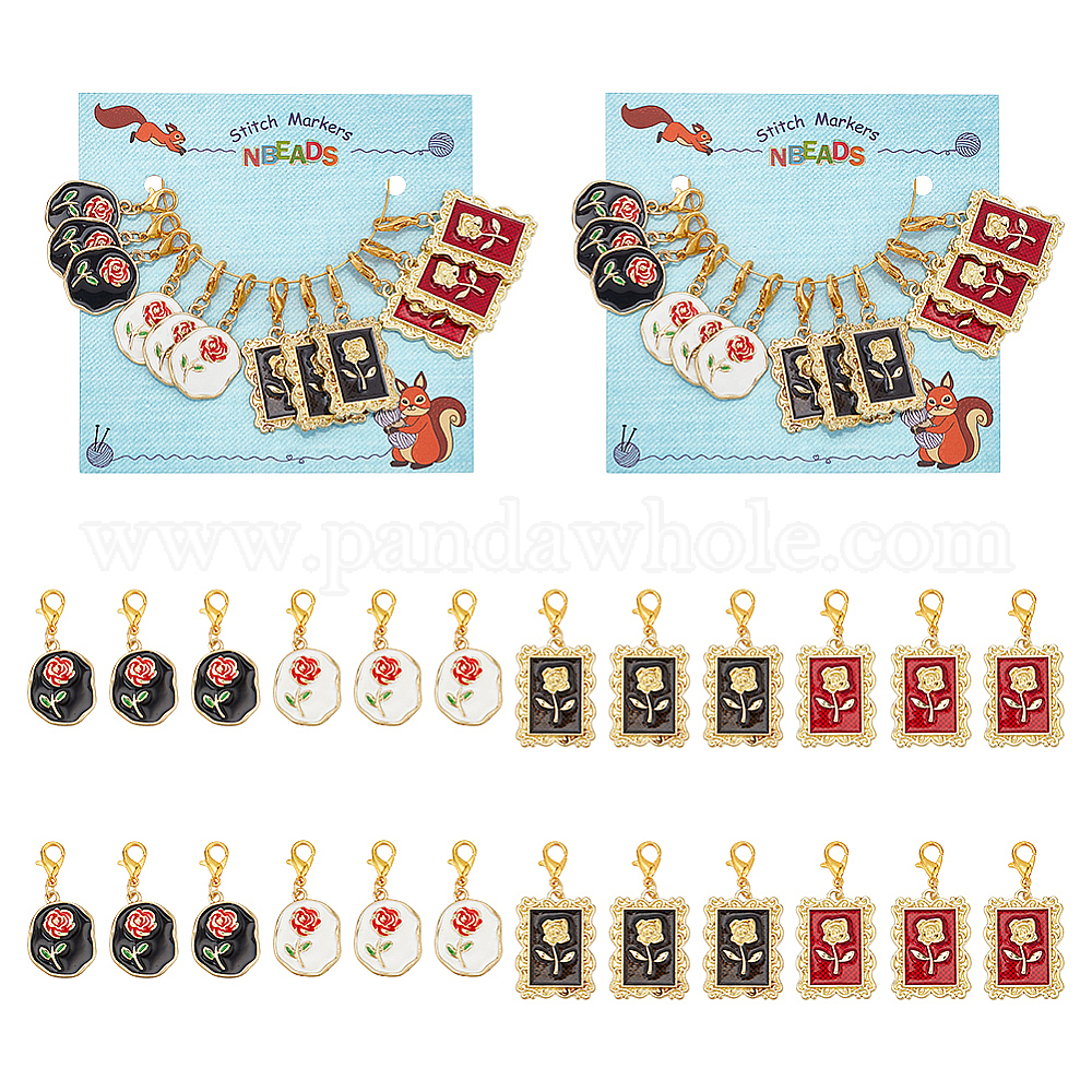 Прямоугольник и овал с маркерами-подвесками в виде розочек, подвески из сплава эмали крючком с застежкой-лобстером, маркер с замком и кольцом с подвеской в виде винного бокала