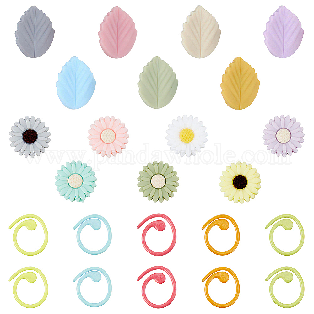 Колпачки для игл из пищевого экологически чистого силикона «Маргаритка и лист», с кольцами-маркерами для вязания из окрашенного цинкового сплава, вязание крючком клипсы