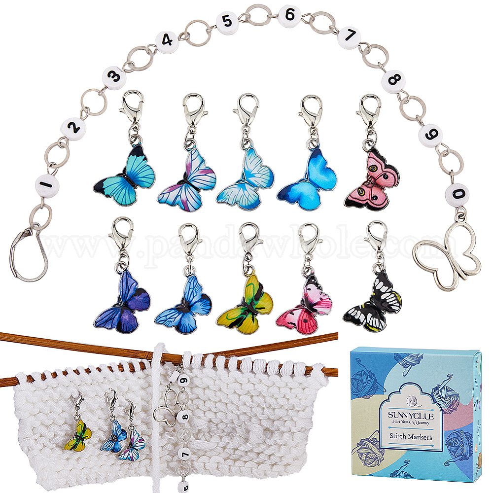 Наборы инструментов для вязания своими руками, включая маркеры подвесных петель из эмалированного сплава «бабочка» и счетные цепочки для вязания бисером.