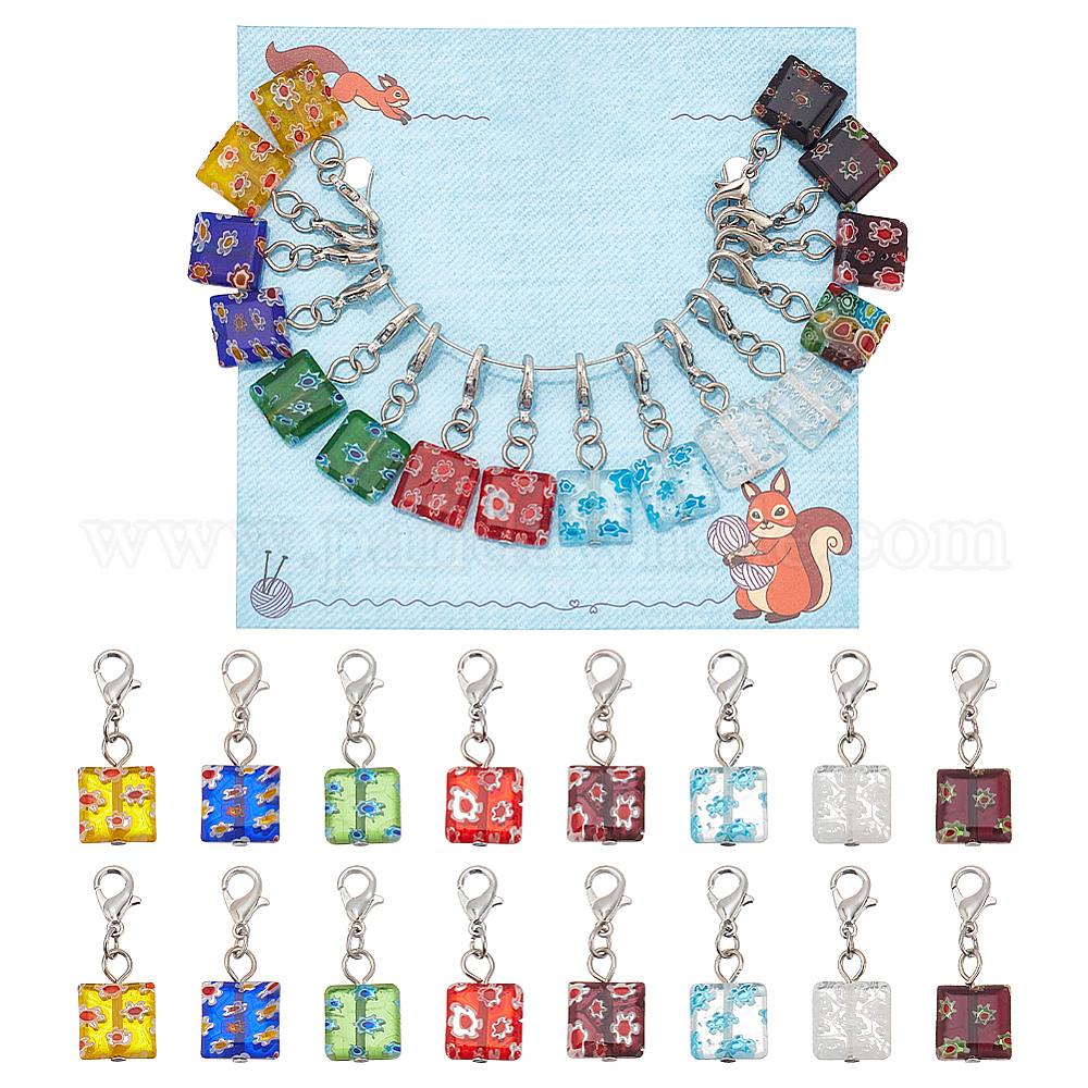 16шт. квадратные стеклянные подвески миллефиори ручной работы, маркеры для закрепки стежков, Подвески с застежкой-лобстером из цинкового сплава, связанные крючком