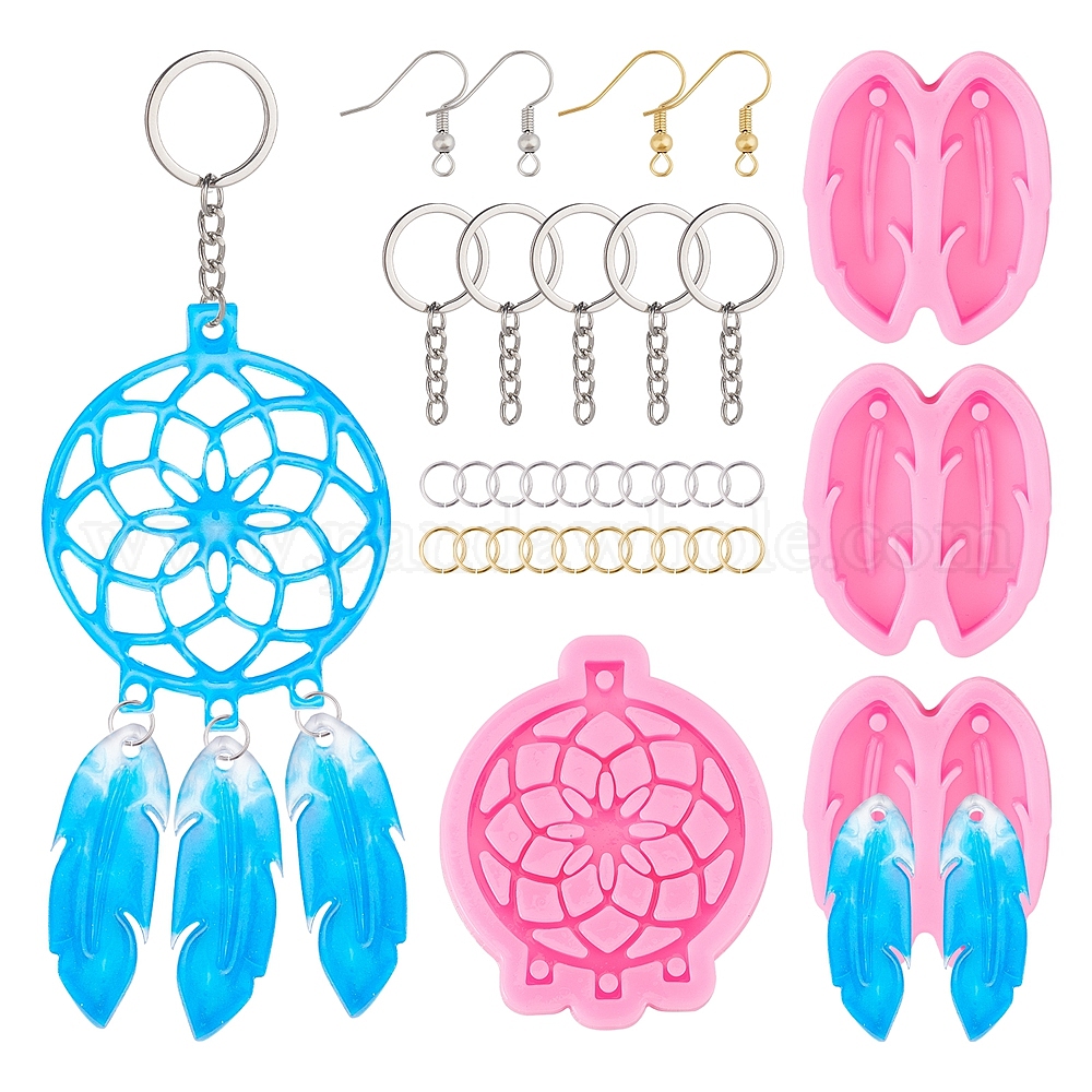 Брелок и серьги своими руками из эпоксидной смолы, в том числе тканая сетка / полотно с силиконовыми формами из пера и пера, латунные крючки для серег и открытые прыжковые кольца, железа отделились брелоки